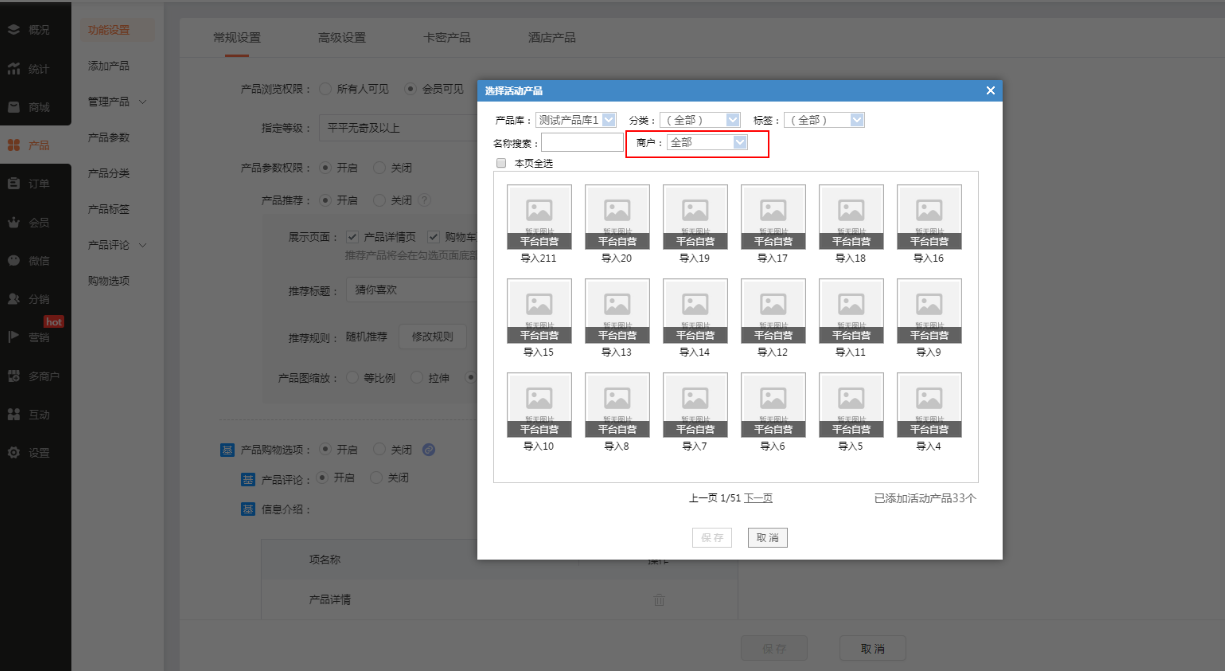 (1)在多商户商城产品推荐的指定产品规则中,添加产品弹窗开放【商户】筛选项,主商户可选子商户产品进行推荐。