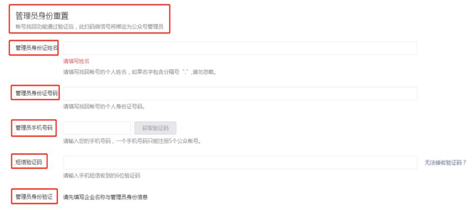其次是管理员身份重置:输入新的小程序管理员的身份证号码以及手机号,手机号将会收到短信验证码进行身份验证。