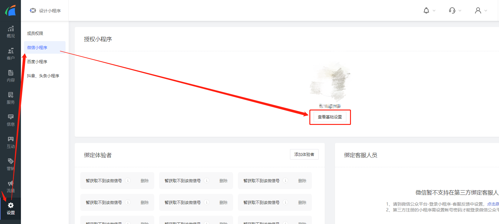 4.1进入轻站小程序管理页面后点击“管理小程序”,等待页面跳转后选择“设置--微信小程序--查看基础设置”。
