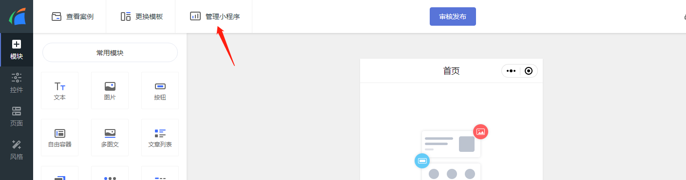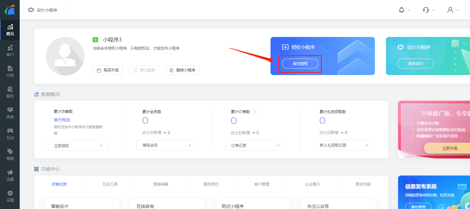 1.1 登陆您的浮云网账号后,进入企业中心页面,点击“轻站小程序”的进入管理按钮。