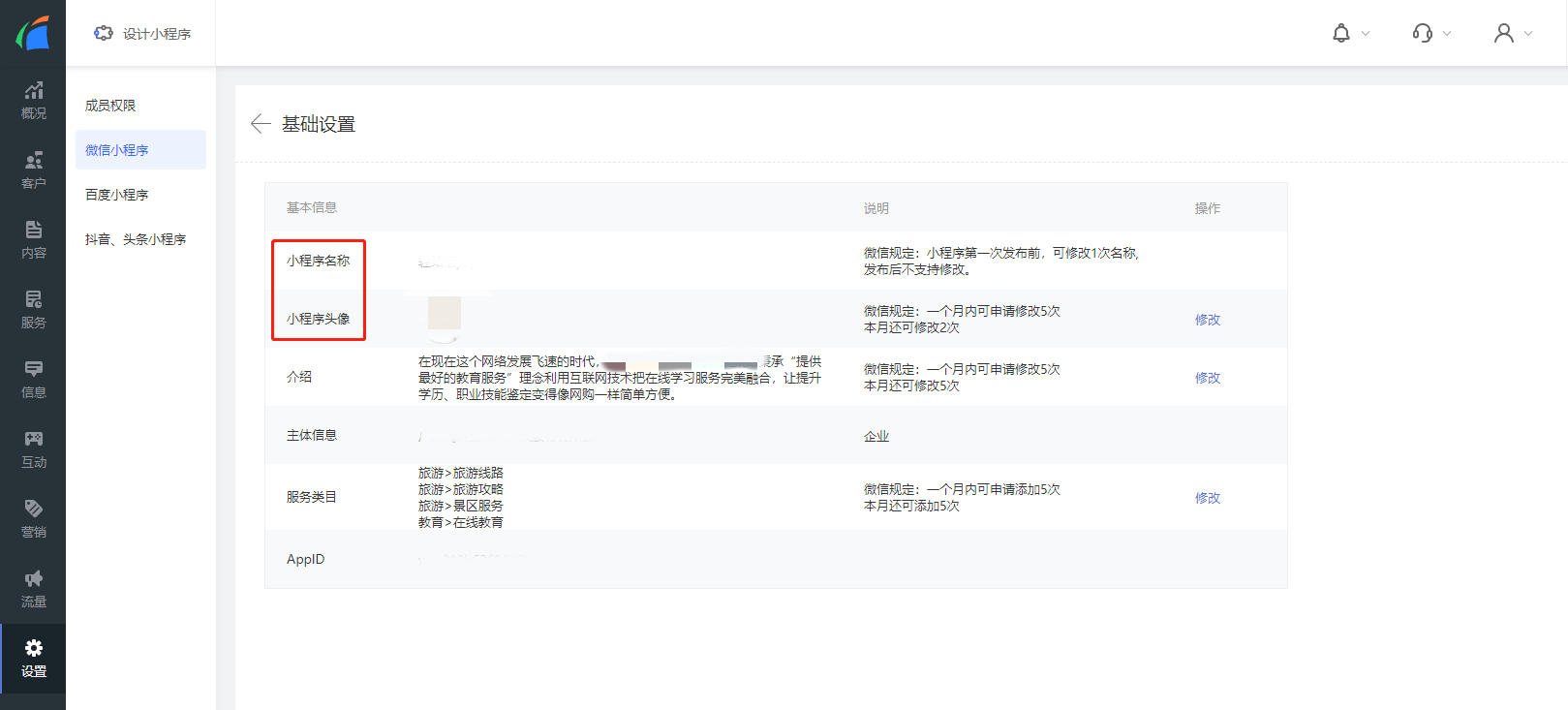4.2 在基础设置页面中,您可以对小程序名称、小程序头像、服务类目、小程序介绍进行逐一修改。
