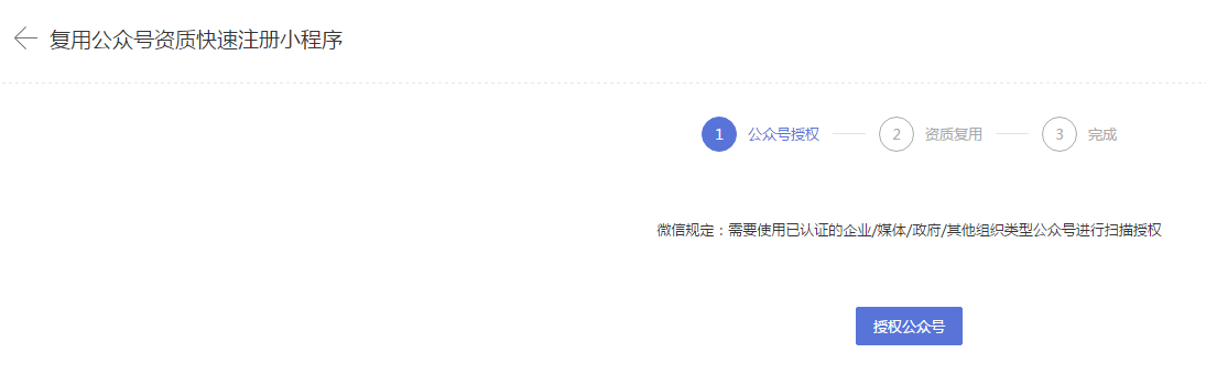 ① 对于拥有已认证公众号的用户,才可使用复用公众号资质进行快速注册。(已认证公众号的主体类型为“企业/媒体/政府/其他组织”)