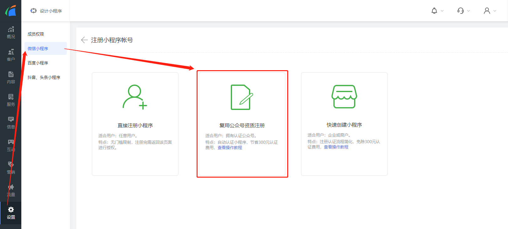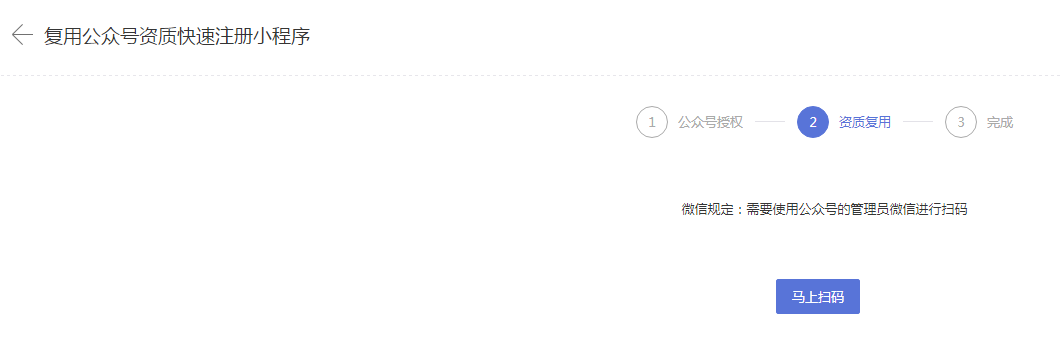 ② 一个已认证的公众号,可在一个月中复用资质注册5个小程序。