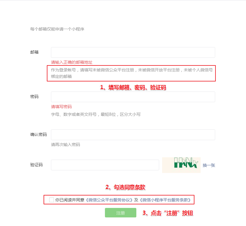 没有已认证公众号的企业用户,可以选择直接注册小程序。用该方法注册,拥有小程序登录账号和密码,方便以后在微信公众平台登录管理小程序功能