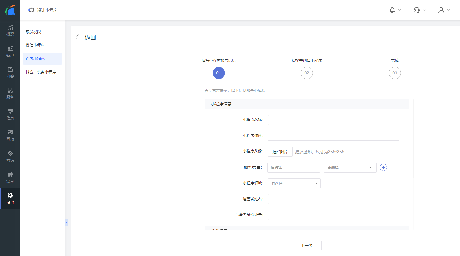 按要求准确填写小程序信息和企业信息,填写完毕后点击下一步。