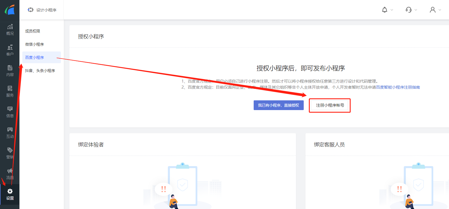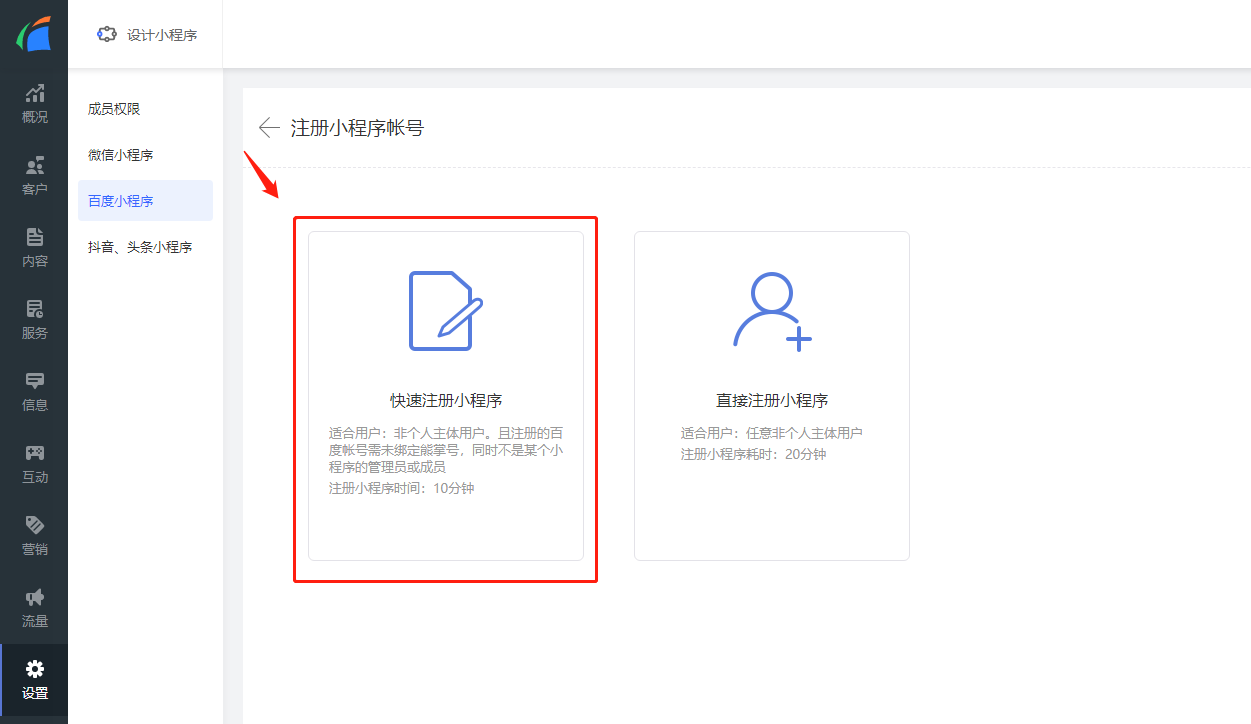 登录您的浮云网帐号,进入【企业中心-轻站小程序-管理小程序-设置-百度小程序-注册小程序帐号】中,点击“快速注册小程序”。