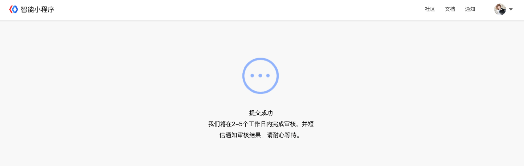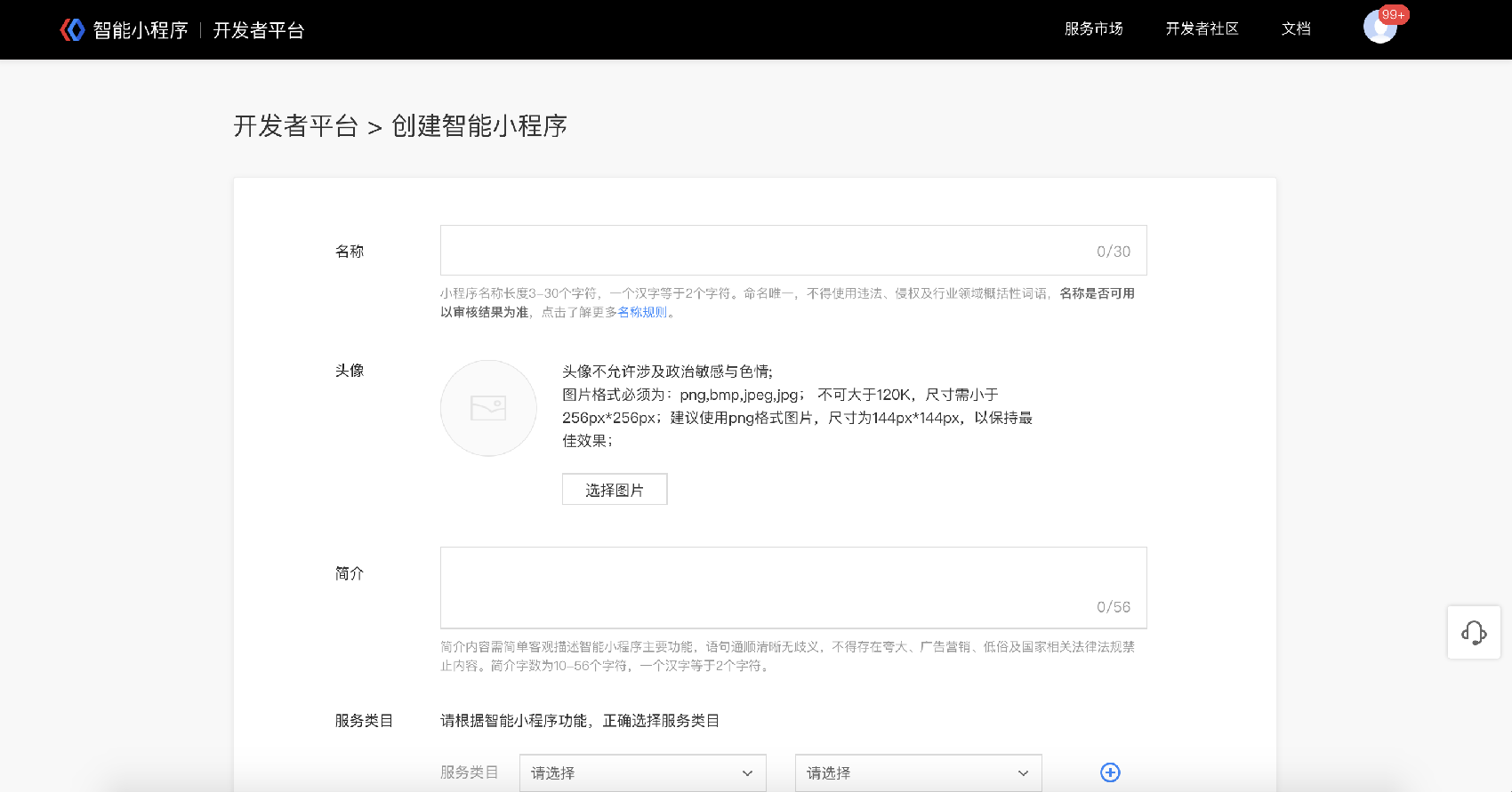 填写智能小程序名称、简介、上传头像并选择服务范围。如果选择为特殊行业,还需根据界面提示提交相应资质,审核预计需要2个工作日完成。