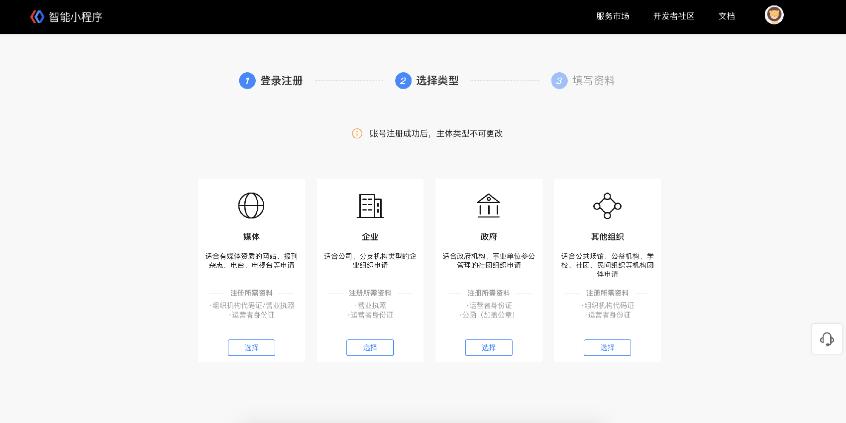 选择对应的主体类型:媒体、企业、政府、其他组织。