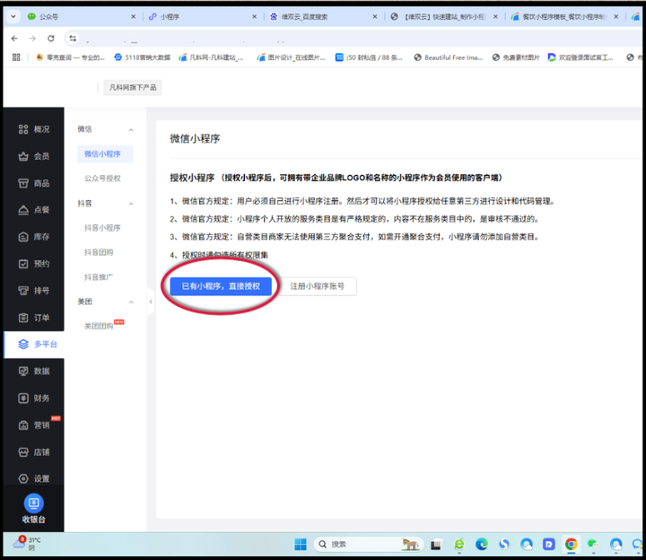 在后台找到「微/信小程序」→ 点击「已有小程序,直接授权」→
