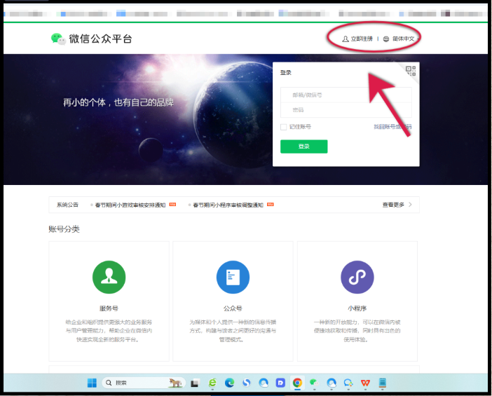 1.进入【微/信公众平台】,点击右上方「立即注册」