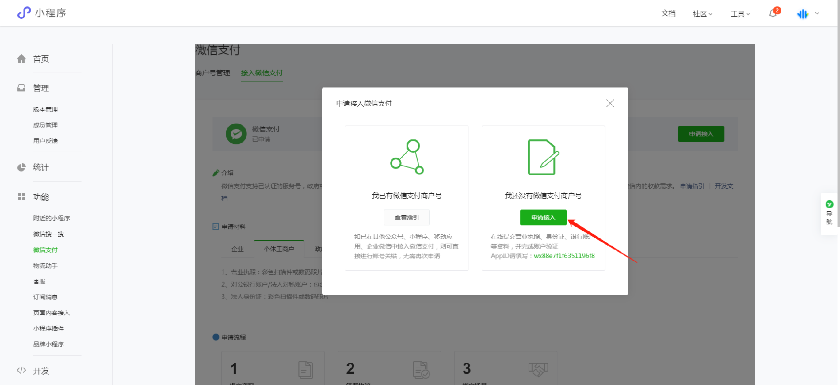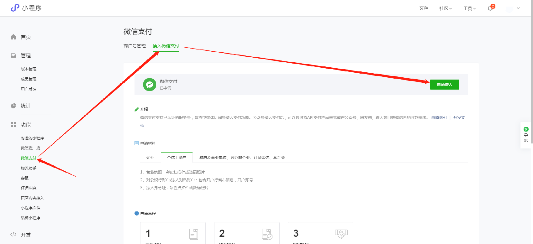1.1 首先,在微信公众平台登录小程序后台,点击后台页面的左下角的【微信支付】,进入【接入微信支付】页面后,点击该页面的【前往申请】按钮: